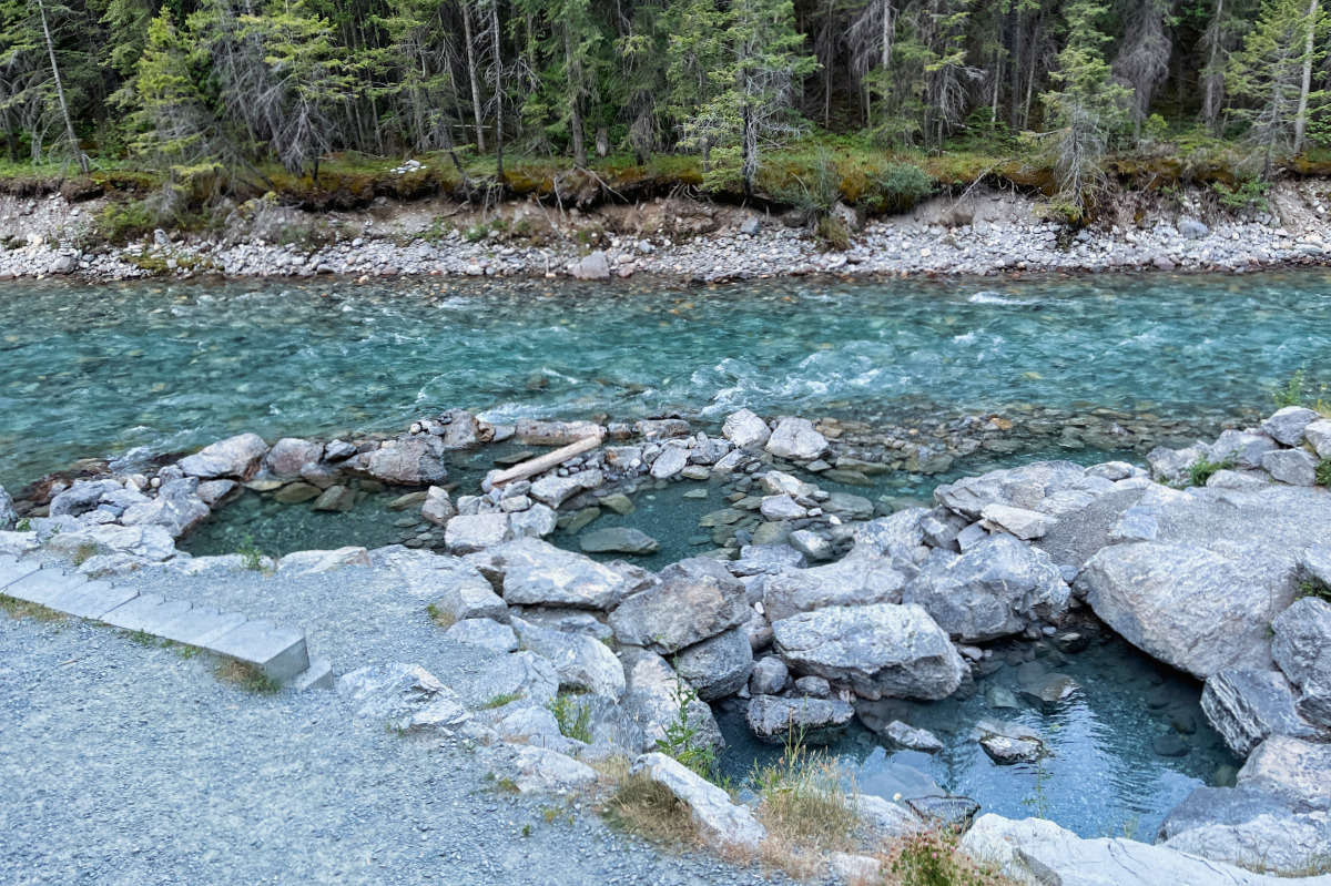 The pipe on the near side is the water outlet, which provides mineral water under the water surface.